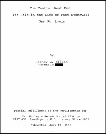 In a 1995 course on post-1865 US history, I wrote a paper about the Central West End (CWE) and the role it played in LGBTQ life, a follow up about the geography of most of the spaces in the previous year’s paper, “‘The Seed Time of Gay Rights’: Rev. Carol Cureton, the Metropolitan Community Church, and Gay St. Louis, 1969-1980.”