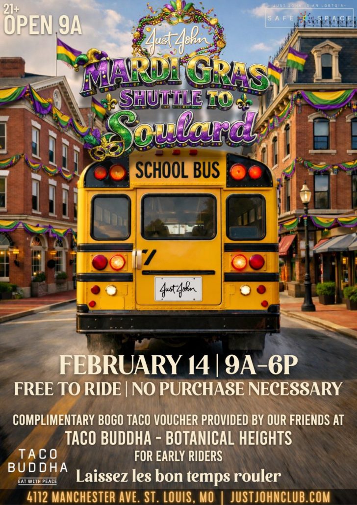 Just John is offering a free shuttle to and from Soulard from 9:00am to 6:00pm.