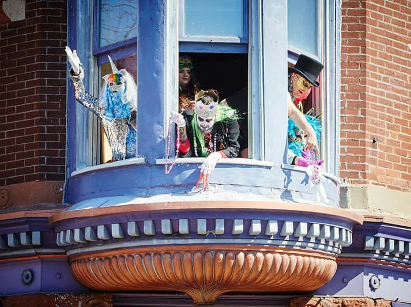 Each Soulard intersection has its own tribe and vibe during Mardi Gras, and the stretch of Russell near Menard is ground zero for LGBTQ+ folks and those who love the spectacle we put on. Known as “The Sequin Circuit,” the compact area is bookended by Bastille and The Hi-Hat Lounge, offering options for shelter should the rain materialize.